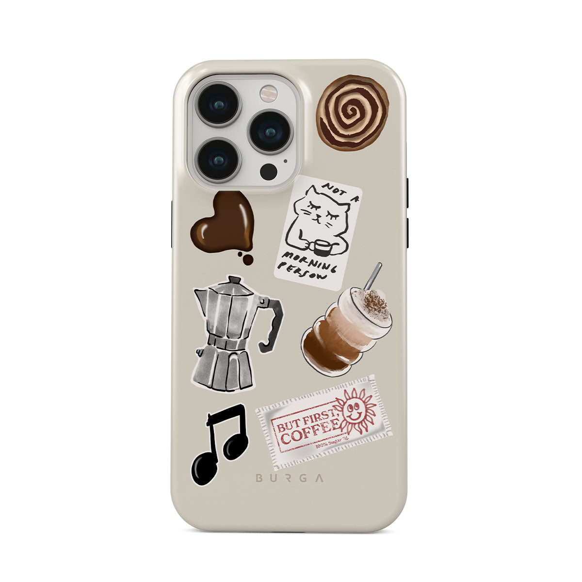 Kenmerken van dit design: mokkapot, frappé, kaneelbroodje, chocoladen hart, sticker "Not a morning person", bonnetje "But First, Coffee", muzieknoot.