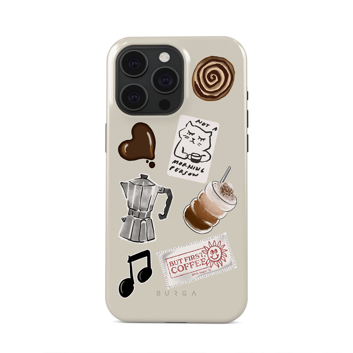 Kenmerken van dit design: mokkapot, frappé, kaneelbroodje, chocoladen hart, sticker "Not a morning person", bonnetje "But First, Coffee", muzieknoot.