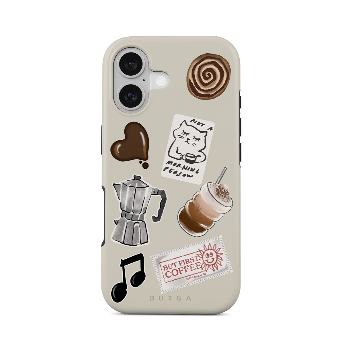 Kenmerken van dit design: mokkapot, frappé, kaneelbroodje, chocoladen hart, sticker "Not a morning person", bonnetje "But First, Coffee", muzieknoot.