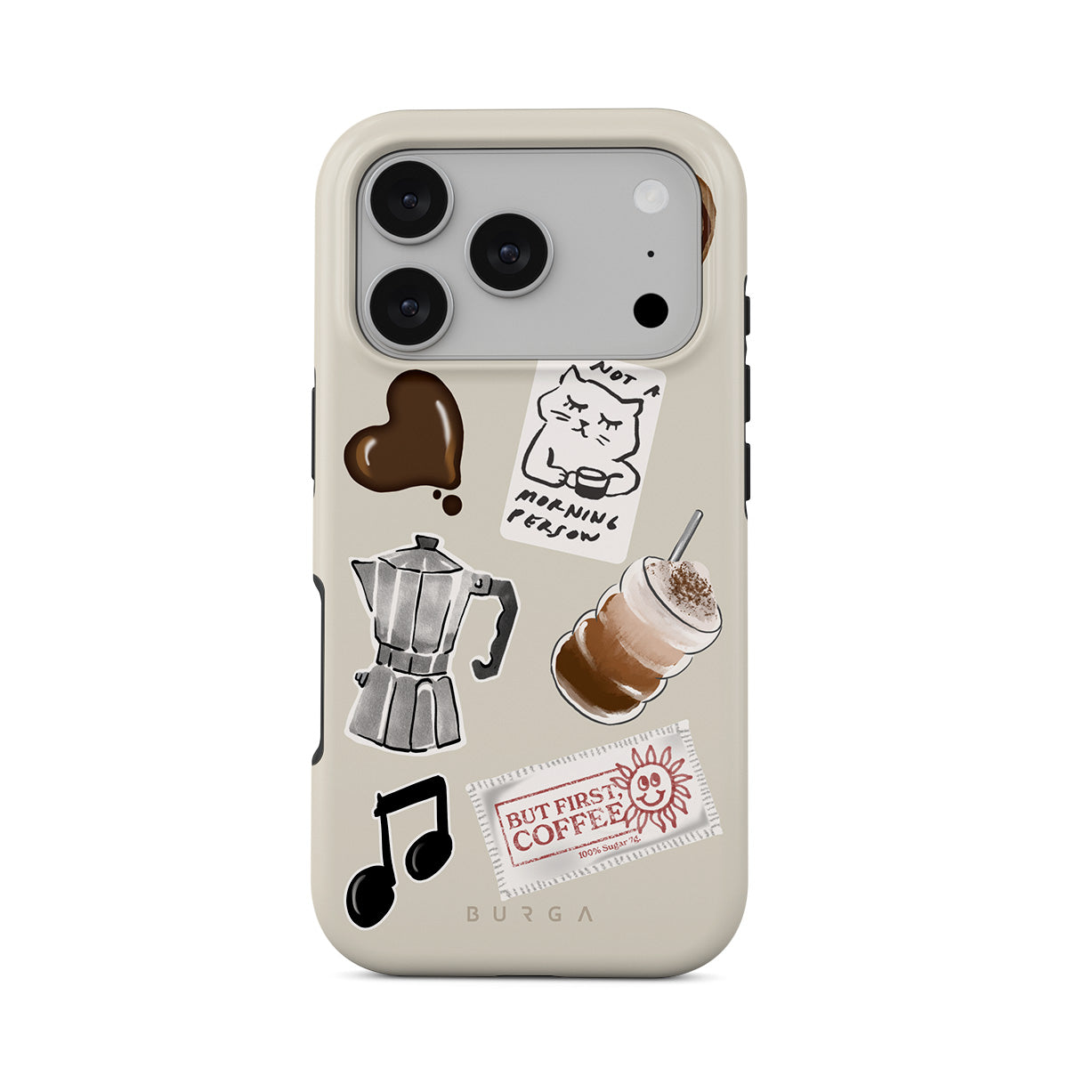 Kenmerken van dit design: mokkapot, frappé, kaneelbroodje, chocoladen hart, sticker "Not a morning person", bonnetje "But First, Coffee", muzieknoot.