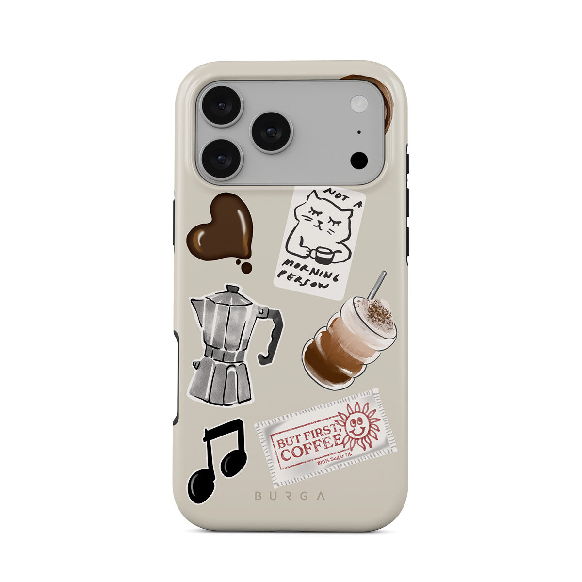 Kenmerken van dit design: mokkapot, frappé, kaneelbroodje, chocoladen hart, sticker "Not a morning person", bonnetje "But First, Coffee", muzieknoot.