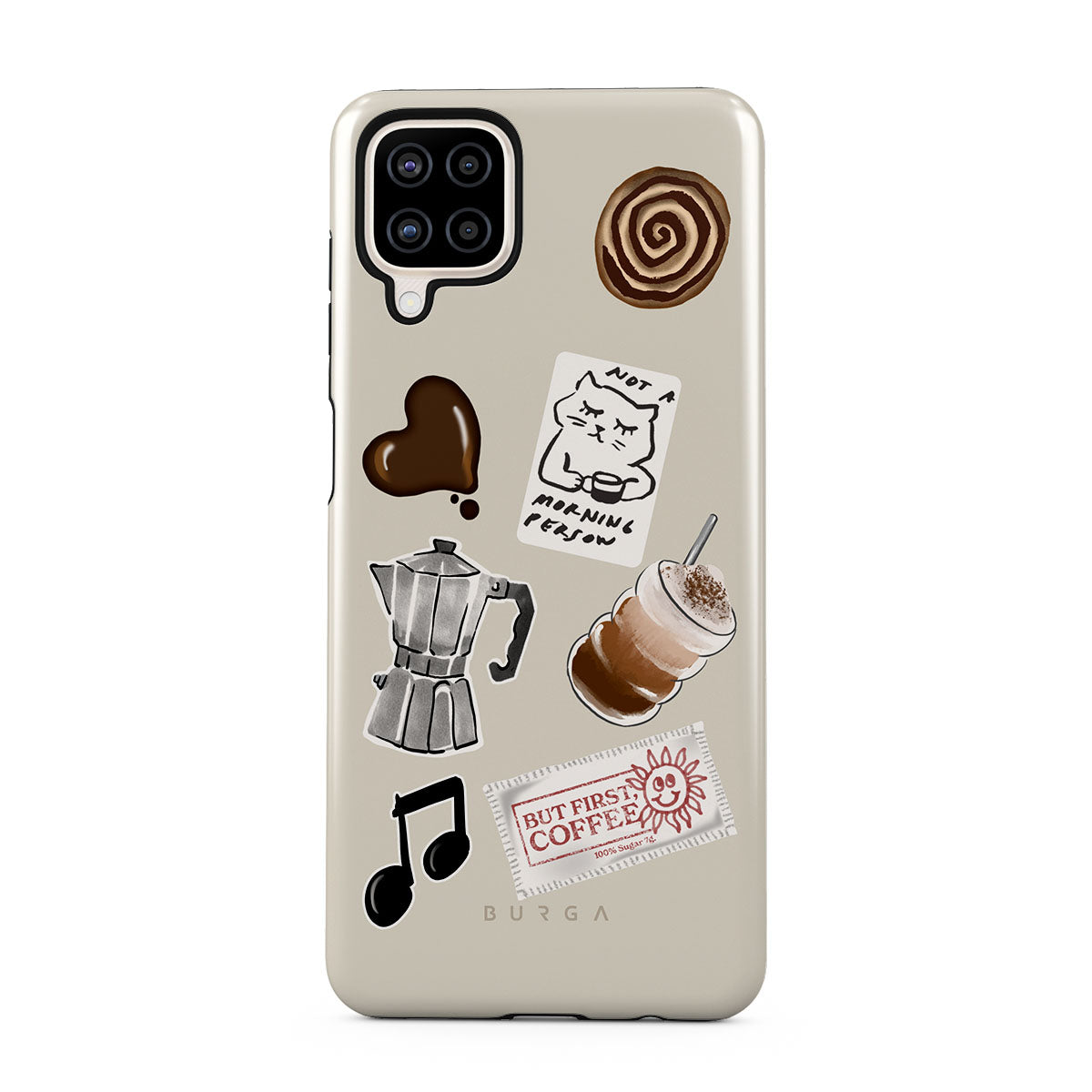 Kenmerken van dit design: mokkapot, frappé, kaneelbroodje, chocoladen hart, sticker "Not a morning person", bonnetje "But First, Coffee", muzieknoot.