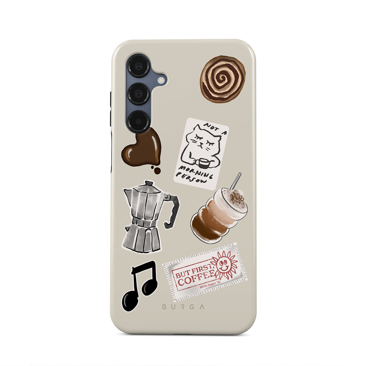 Kenmerken van dit design: mokkapot, frappé, kaneelbroodje, chocoladen hart, sticker "Not a morning person", bonnetje "But First, Coffee", muzieknoot.
