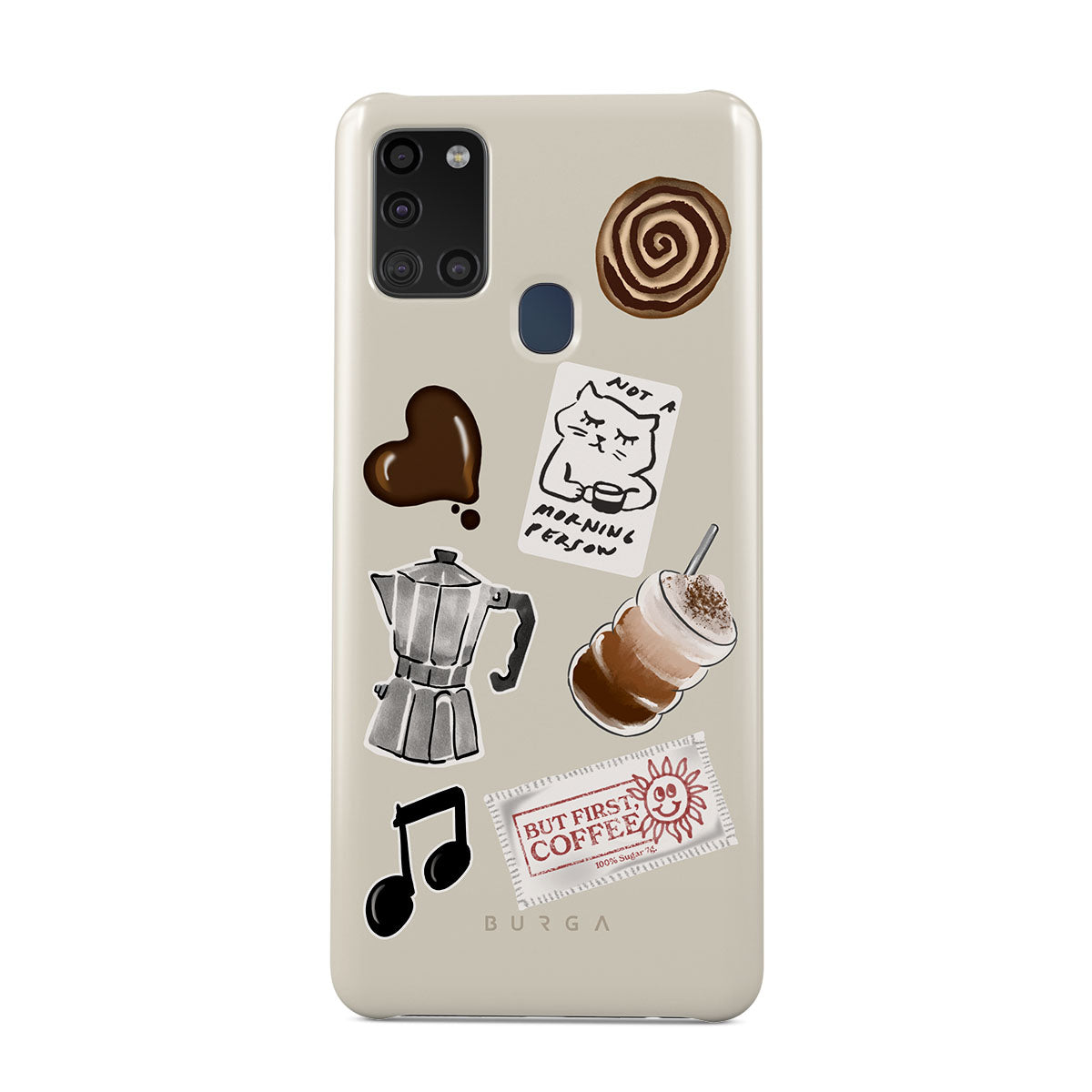 Kenmerken van dit design: mokkapot, frappé, kaneelbroodje, chocoladen hart, sticker "Not a morning person", bonnetje "But First, Coffee", muzieknoot.