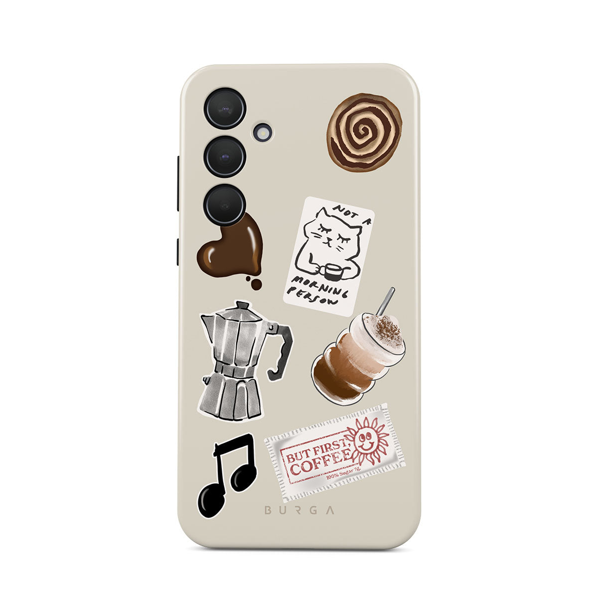 Kenmerken van dit design: mokkapot, frappé, kaneelbroodje, chocoladen hart, sticker "Not a morning person", bonnetje "But First, Coffee", muzieknoot.
