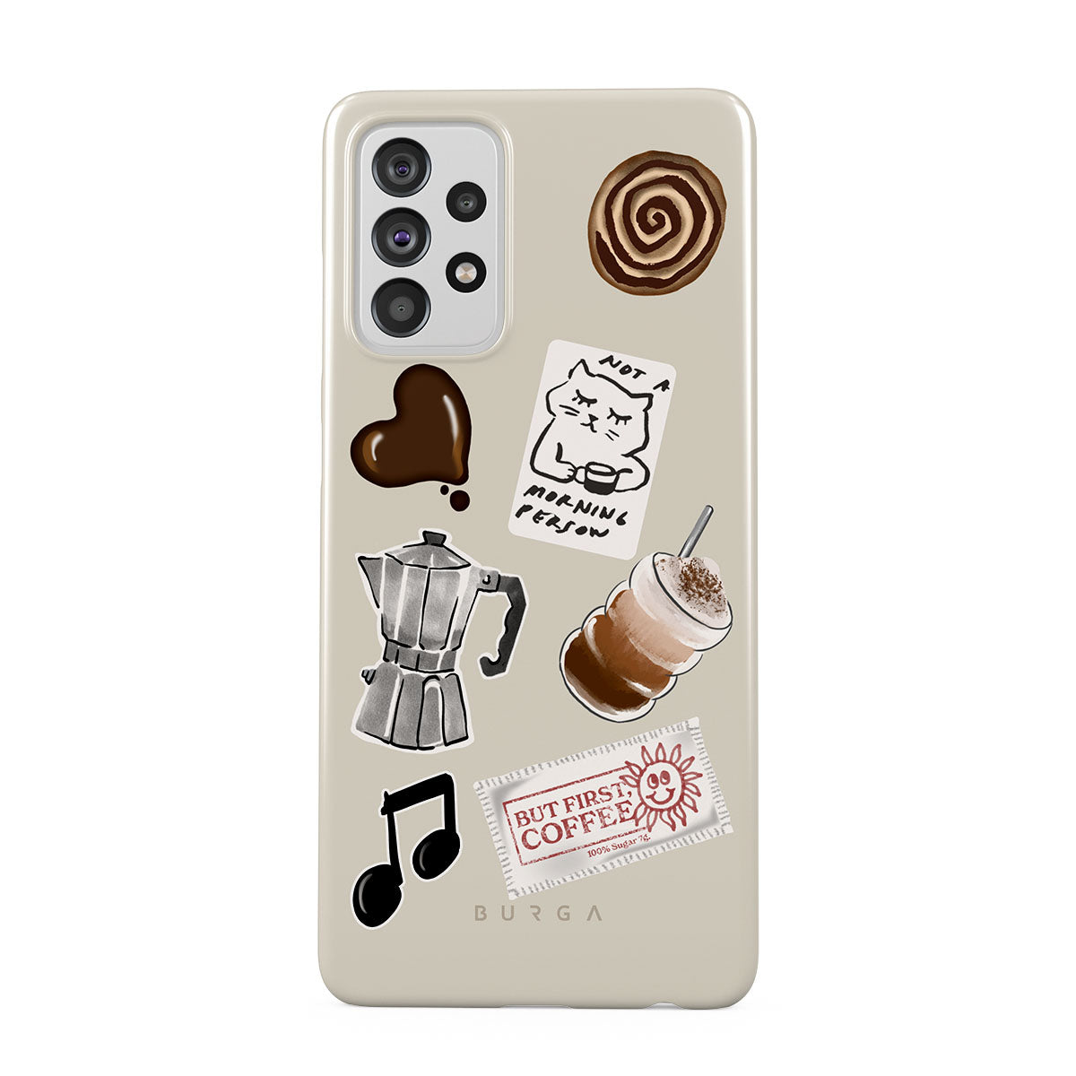 Kenmerken van dit design: mokkapot, frappé, kaneelbroodje, chocoladen hart, sticker "Not a morning person", bonnetje "But First, Coffee", muzieknoot.