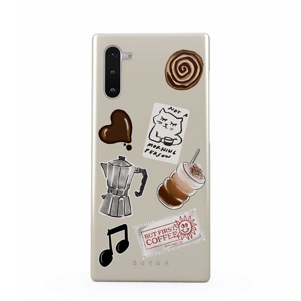 Kenmerken van dit design: mokkapot, frappé, kaneelbroodje, chocoladen hart, sticker "Not a morning person", bonnetje "But First, Coffee", muzieknoot.