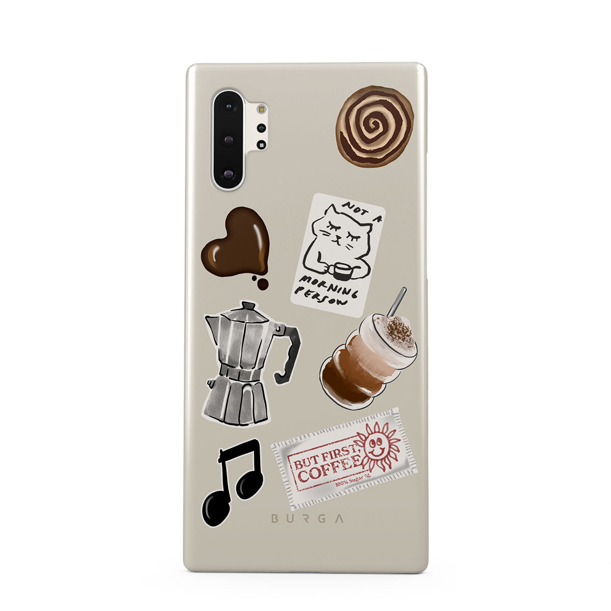 Kenmerken van dit design: mokkapot, frappé, kaneelbroodje, chocoladen hart, sticker "Not a morning person", bonnetje "But First, Coffee", muzieknoot.