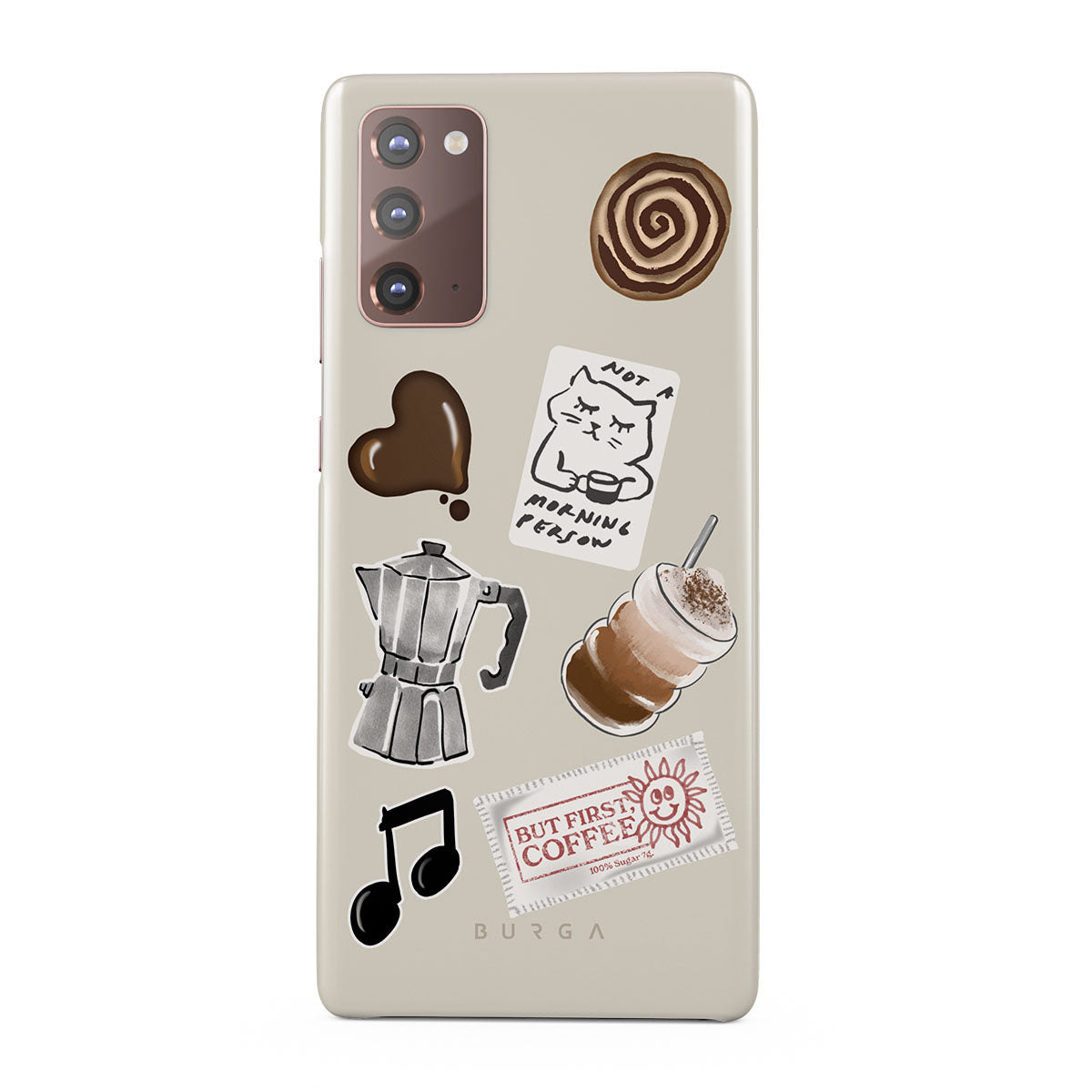 Kenmerken van dit design: mokkapot, frappé, kaneelbroodje, chocoladen hart, sticker "Not a morning person", bonnetje "But First, Coffee", muzieknoot.