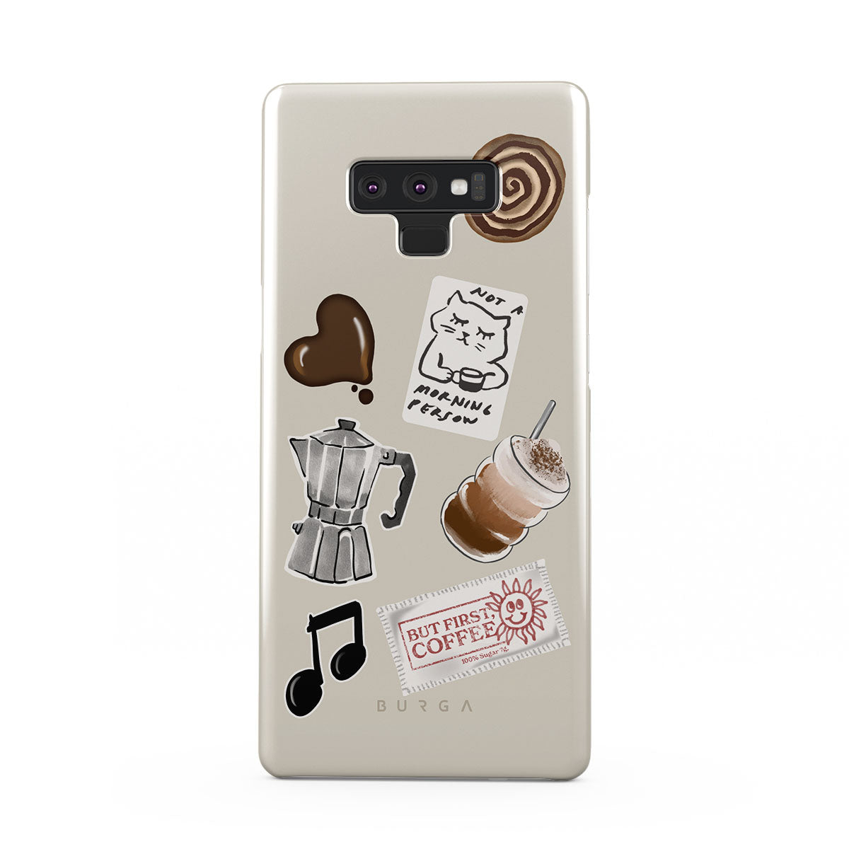 Kenmerken van dit design: mokkapot, frappé, kaneelbroodje, chocoladen hart, sticker "Not a morning person", bonnetje "But First, Coffee", muzieknoot.