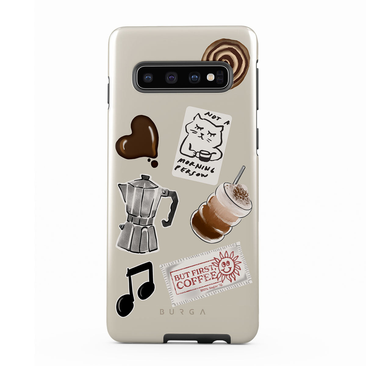 Kenmerken van dit design: mokkapot, frappé, kaneelbroodje, chocoladen hart, sticker "Not a morning person", bonnetje "But First, Coffee", muzieknoot.