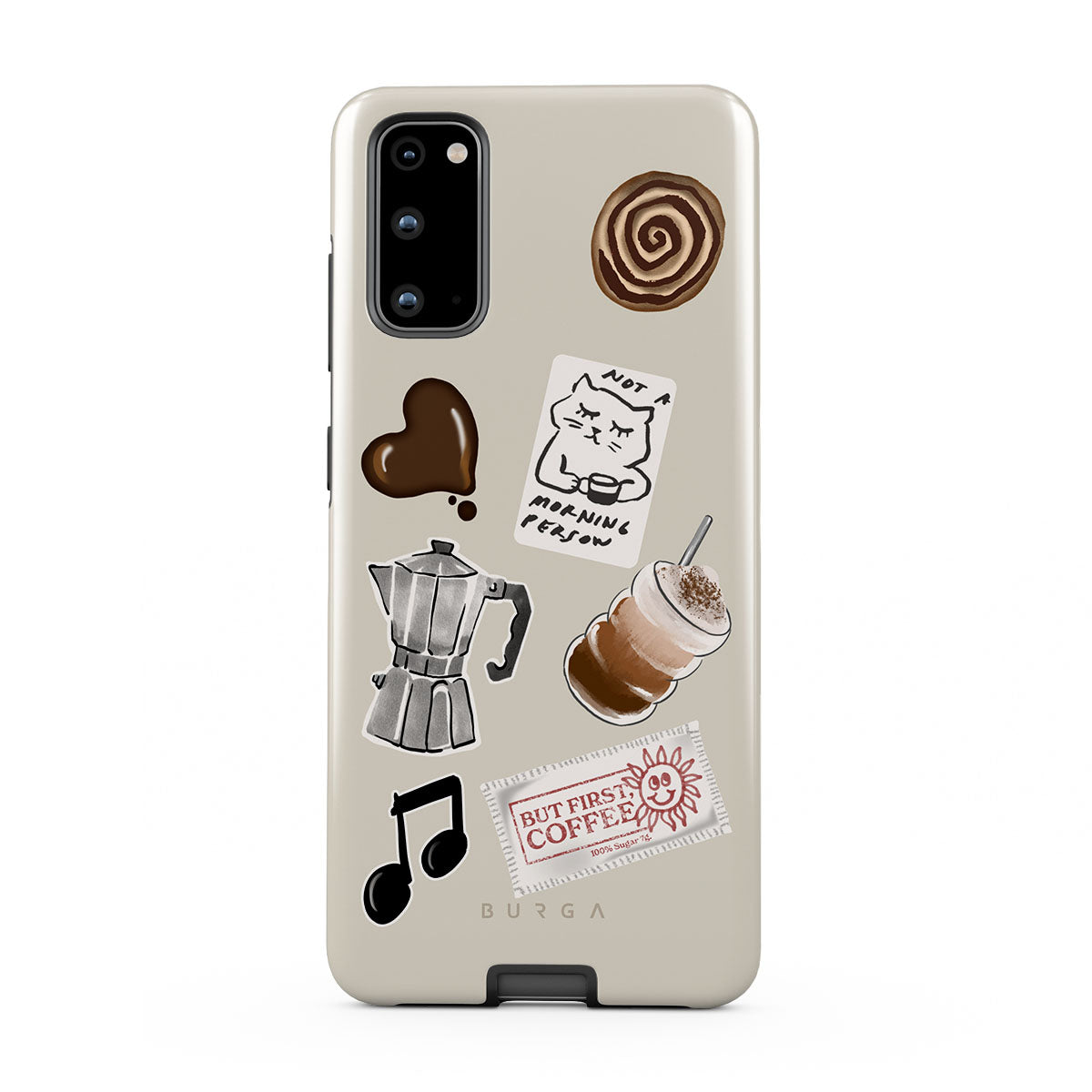 Kenmerken van dit design: mokkapot, frappé, kaneelbroodje, chocoladen hart, sticker "Not a morning person", bonnetje "But First, Coffee", muzieknoot.