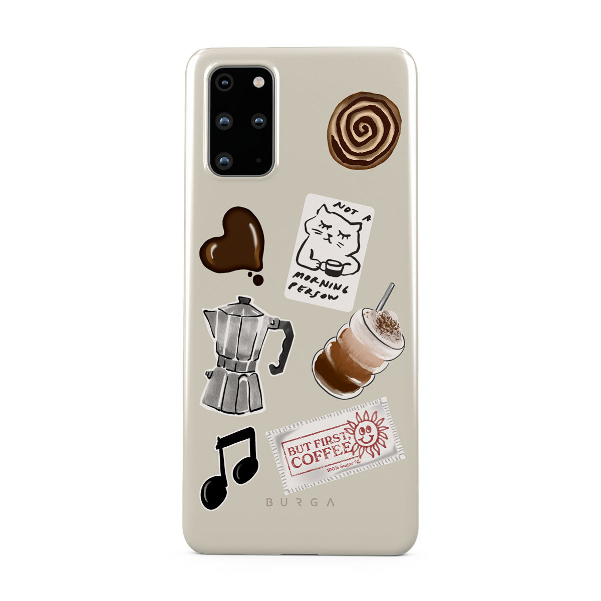 Kenmerken van dit design: mokkapot, frappé, kaneelbroodje, chocoladen hart, sticker "Not a morning person", bonnetje "But First, Coffee", muzieknoot.