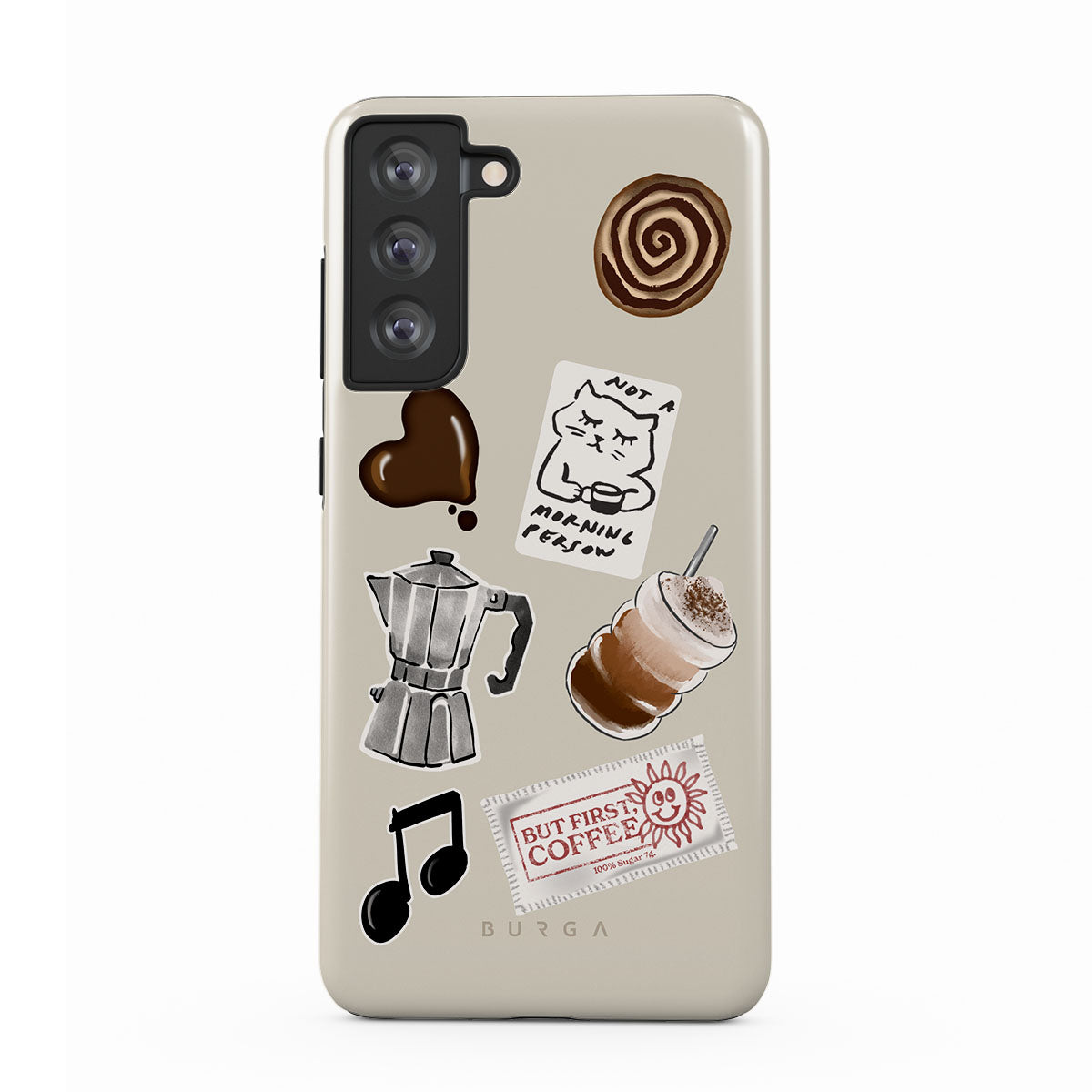 Kenmerken van dit design: mokkapot, frappé, kaneelbroodje, chocoladen hart, sticker "Not a morning person", bonnetje "But First, Coffee", muzieknoot.