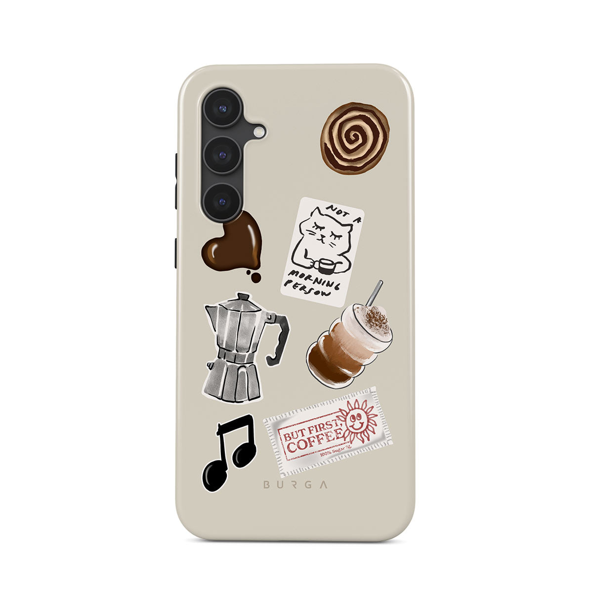 Kenmerken van dit design: mokkapot, frappé, kaneelbroodje, chocoladen hart, sticker "Not a morning person", bonnetje "But First, Coffee", muzieknoot.