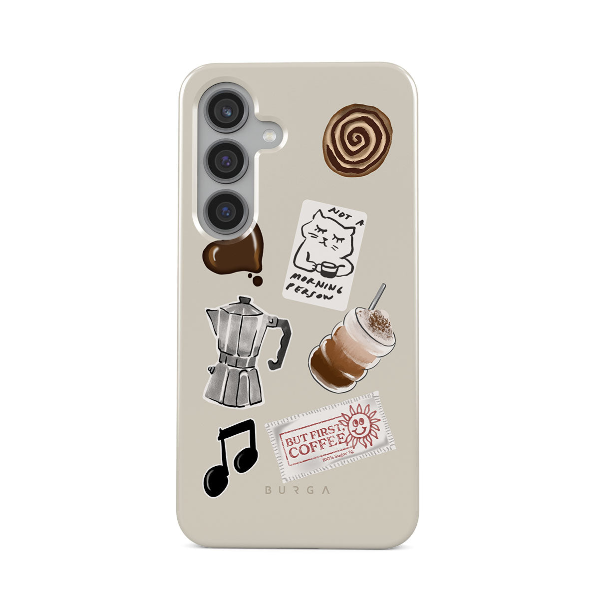 Kenmerken van dit design: mokkapot, frappé, kaneelbroodje, chocoladen hart, sticker "Not a morning person", bonnetje "But First, Coffee", muzieknoot.