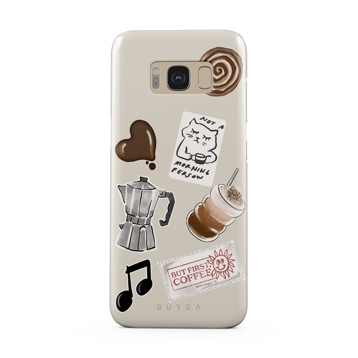 Kenmerken van dit design: mokkapot, frappé, kaneelbroodje, chocoladen hart, sticker "Not a morning person", bonnetje "But First, Coffee", muzieknoot.