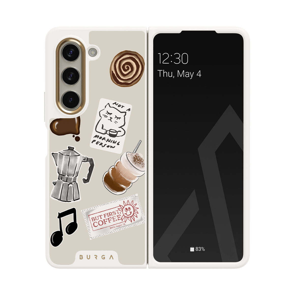 Kenmerken van dit design: mokkapot, frappé, kaneelbroodje, chocoladen hart, sticker "Not a morning person", bonnetje "But First, Coffee", muzieknoot.