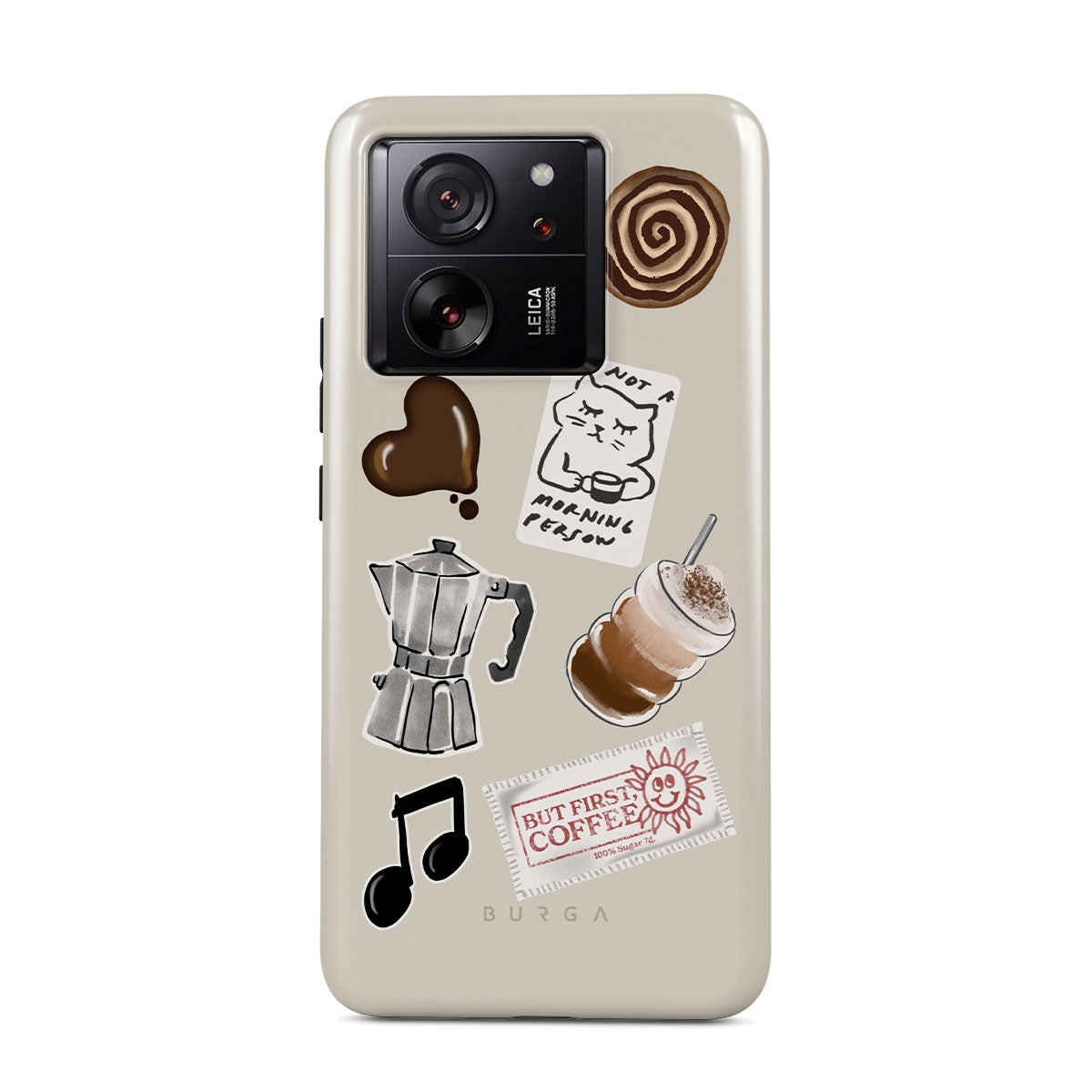 Kenmerken van dit design: mokkapot, frappé, kaneelbroodje, chocoladen hart, sticker "Not a morning person", bonnetje "But First, Coffee", muzieknoot.