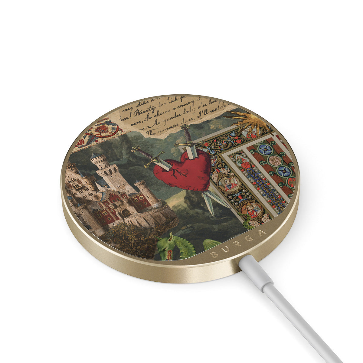 Kenmerken van dit design: handgeschreven kalligrafisch lettertype, vintage print, middeleeuws design, bloemenpatroon, oude boekillustraties, hart, draak, kasteel