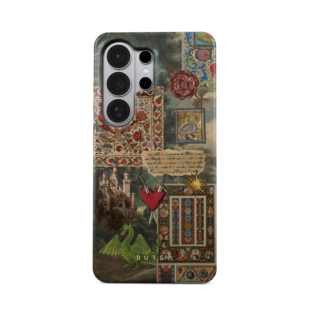 Kenmerken van dit design: handgeschreven kalligrafisch lettertype, vintage print, middeleeuws design, bloemenpatroon, oude boekillustraties, hart, draak, kasteel