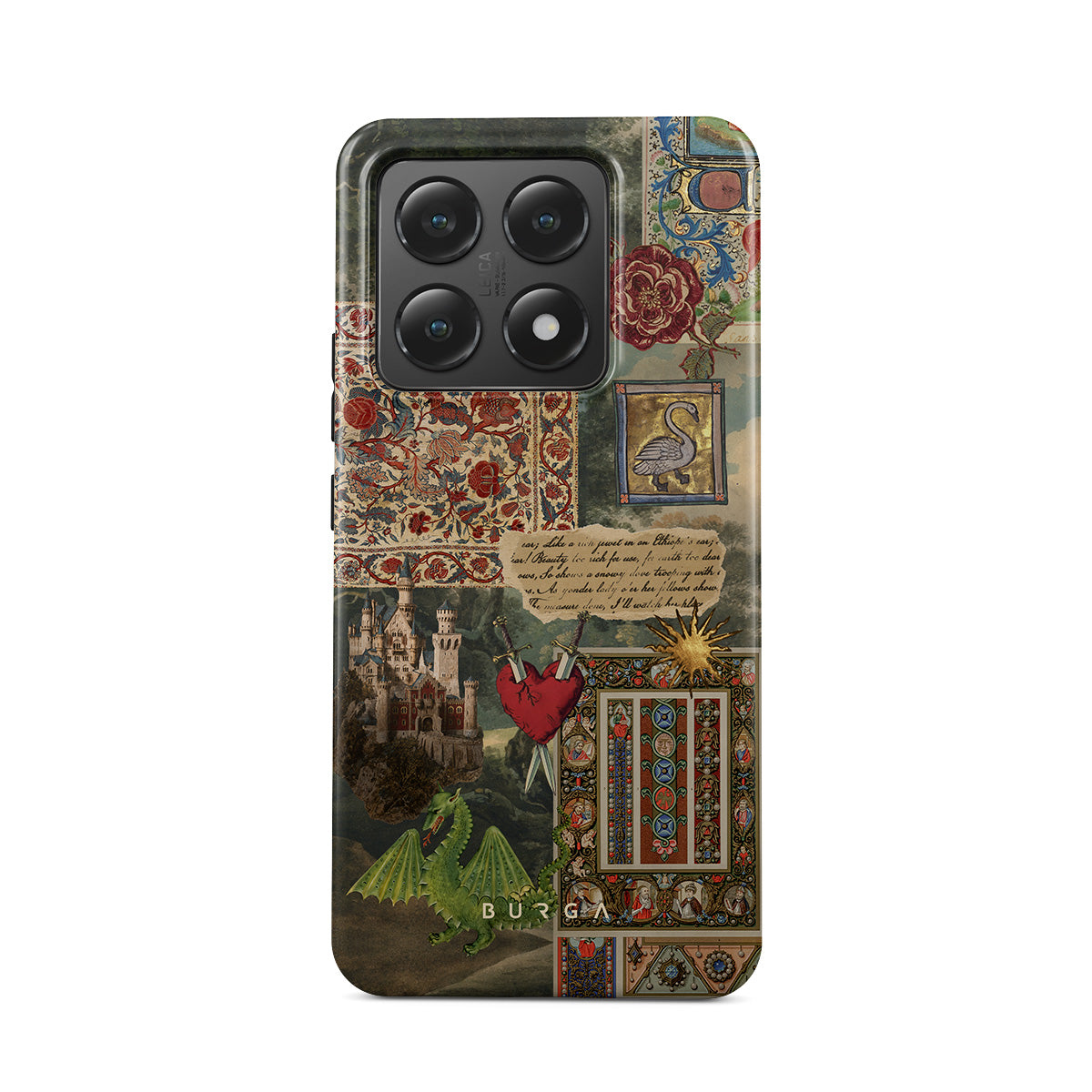 Kenmerken van dit design: handgeschreven kalligrafisch lettertype, vintage print, middeleeuws design, bloemenpatroon, oude boekillustraties, hart, draak, kasteel