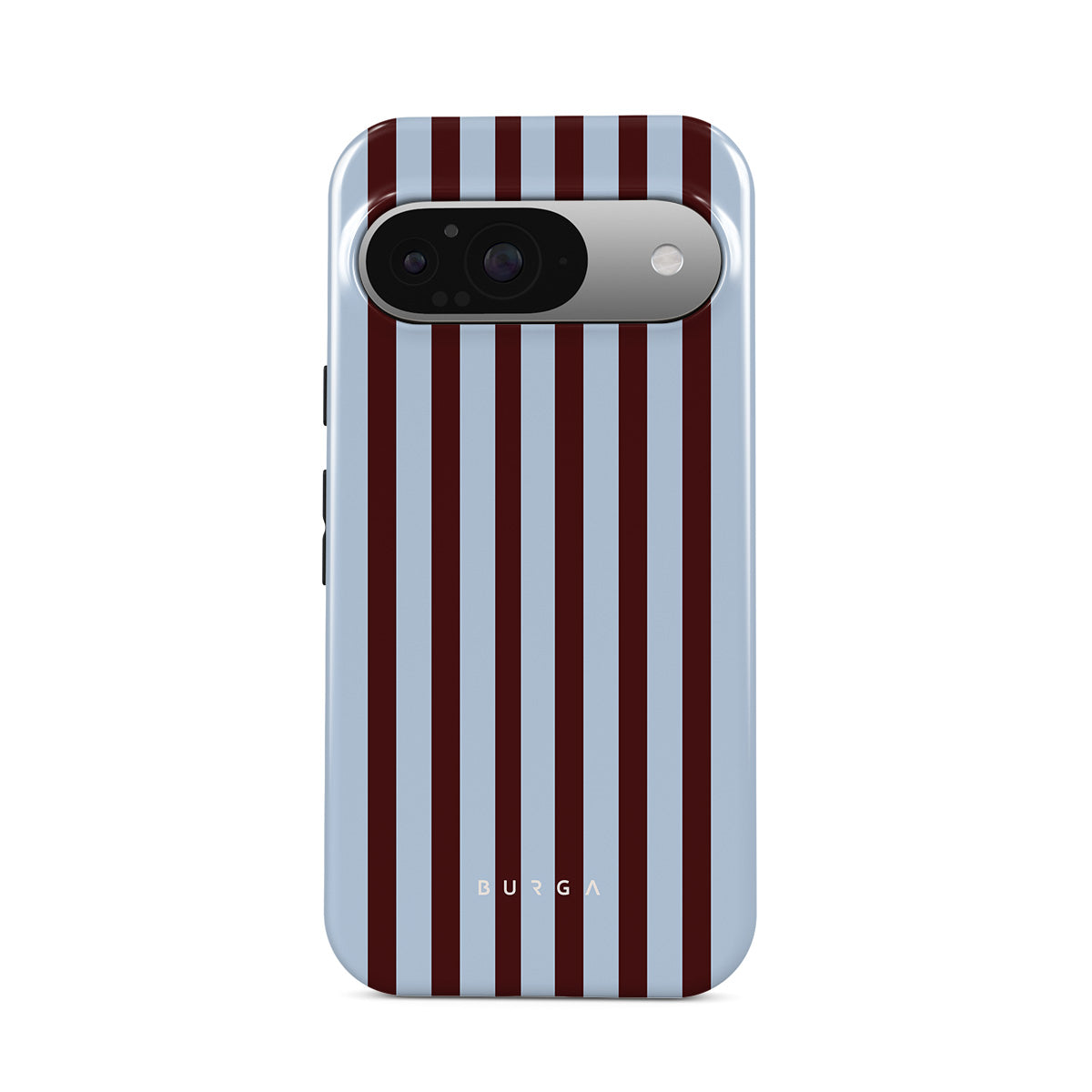 Kenmerken van dit design: verticale strepen in bruin en babyblauw.