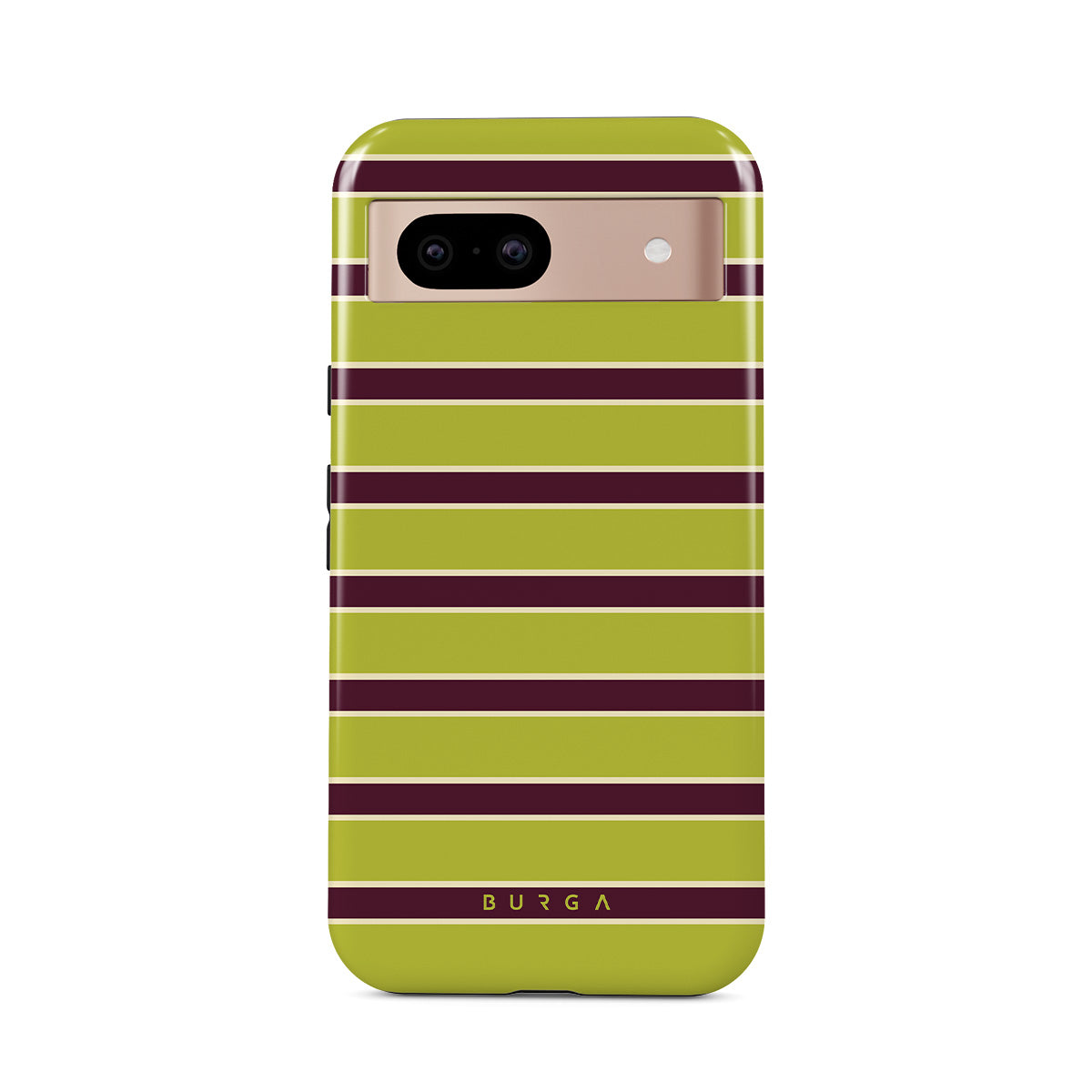 Kenmerken van dit design: dikke horizontale strepen in limoengroen en bordeaux.