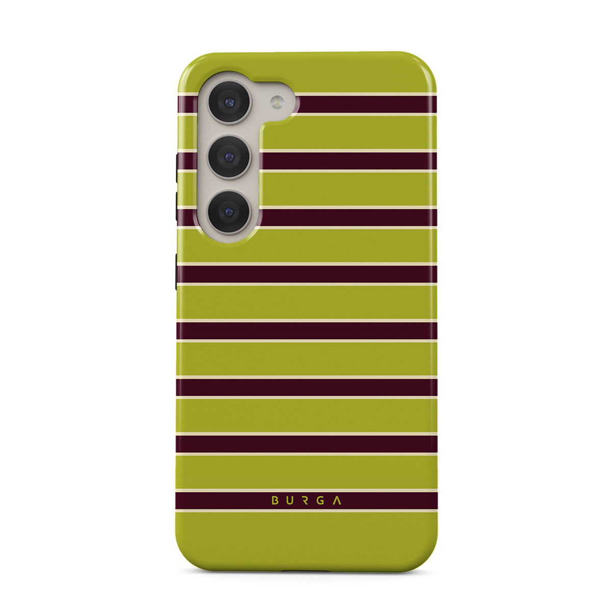 Kenmerken van dit design: dikke horizontale strepen in limoengroen en bordeaux.