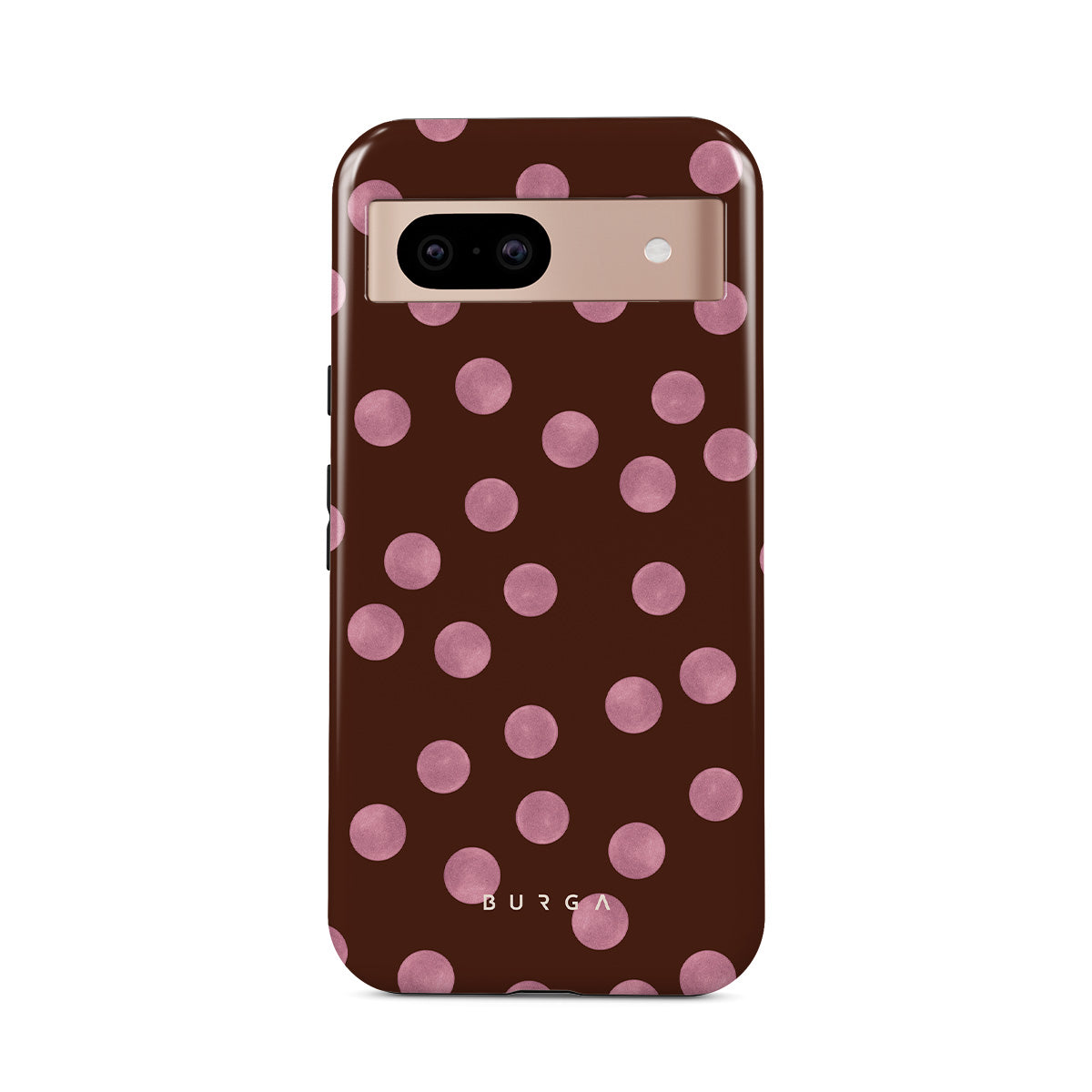 Kenmerken van dit design: roze stippen, bruine achtergrond, stippenpatroon