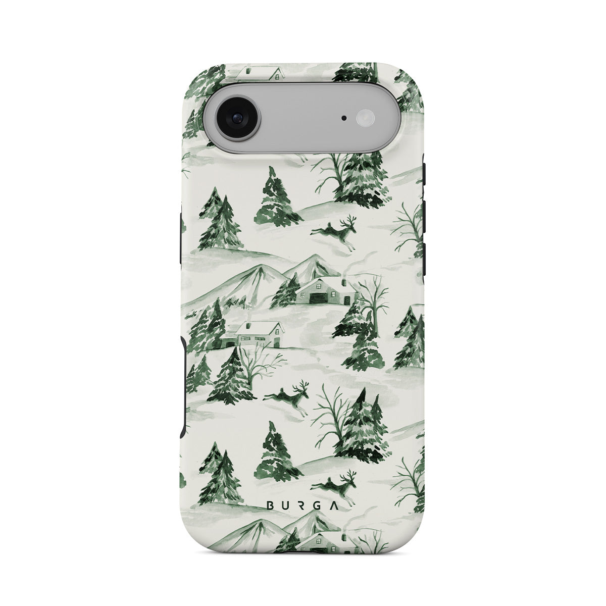 Kenmerken van dit design: winterse boslandschap, dennenbomen, sneeuwlandschap, groen en wit, natuurpatroon, boskerstmis, altijdgroene bomen, vintage illustratiestijl
