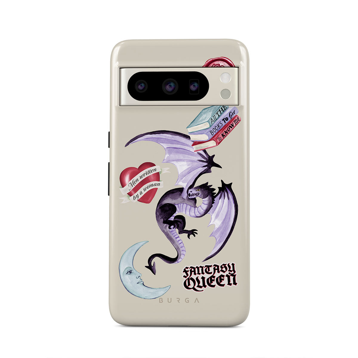Kenmerken van dit design: paarse draak, sticker "Fantasy Queen", halve maan, paarse lakzegel, hart met boodschap, boeken.