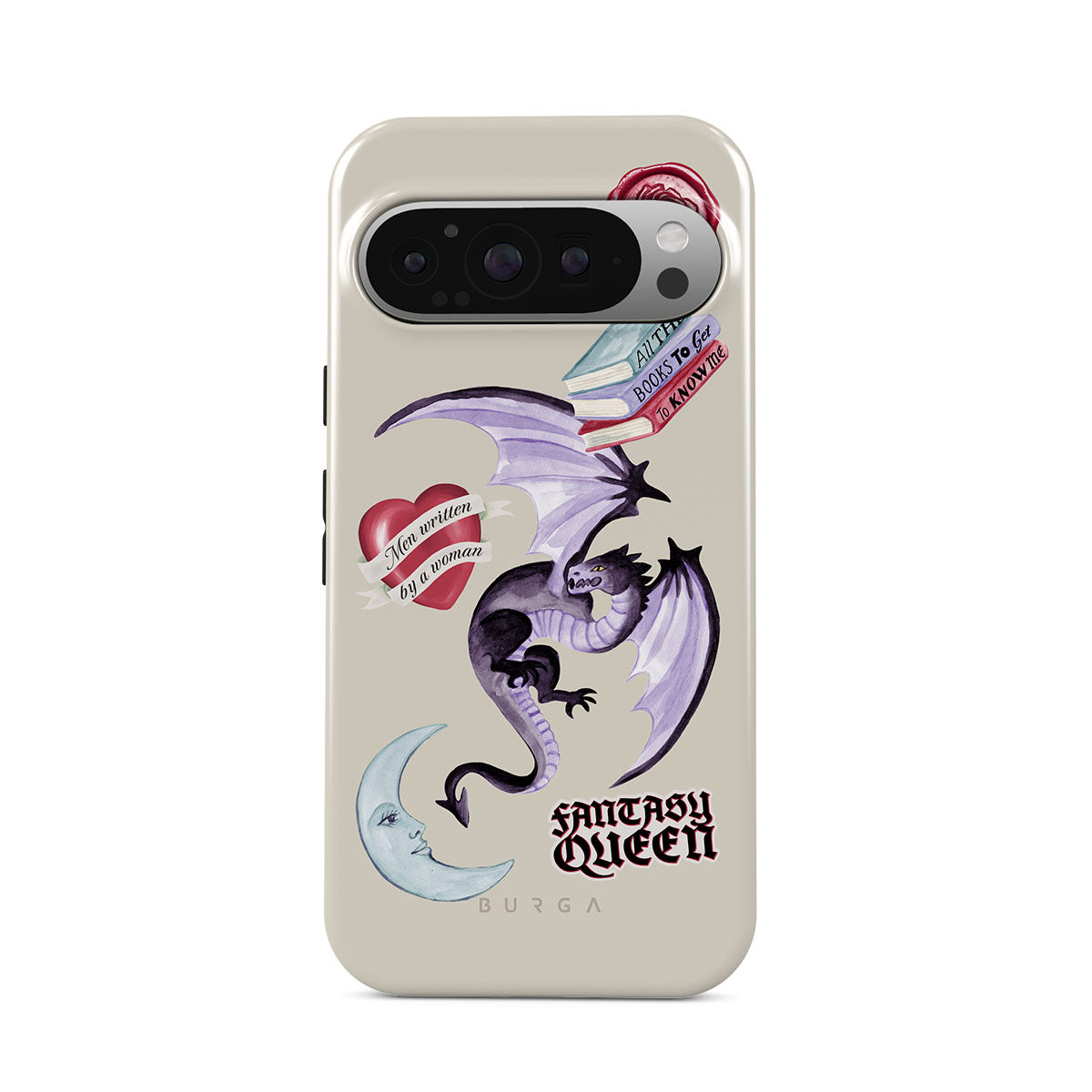 Kenmerken van dit design: paarse draak, sticker "Fantasy Queen", halve maan, paarse lakzegel, hart met boodschap, boeken.