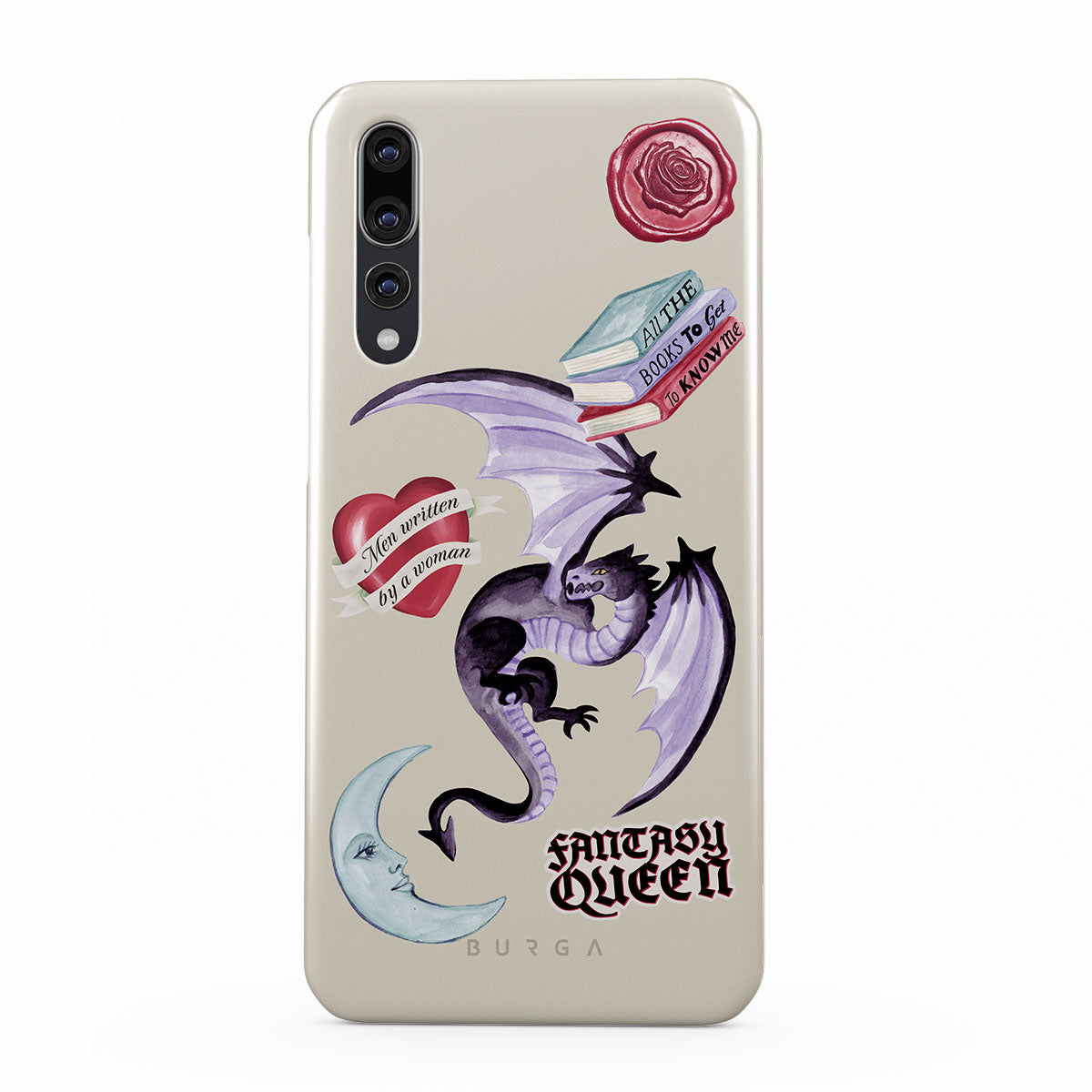 Kenmerken van dit design: paarse draak, sticker "Fantasy Queen", halve maan, paarse lakzegel, hart met boodschap, boeken.