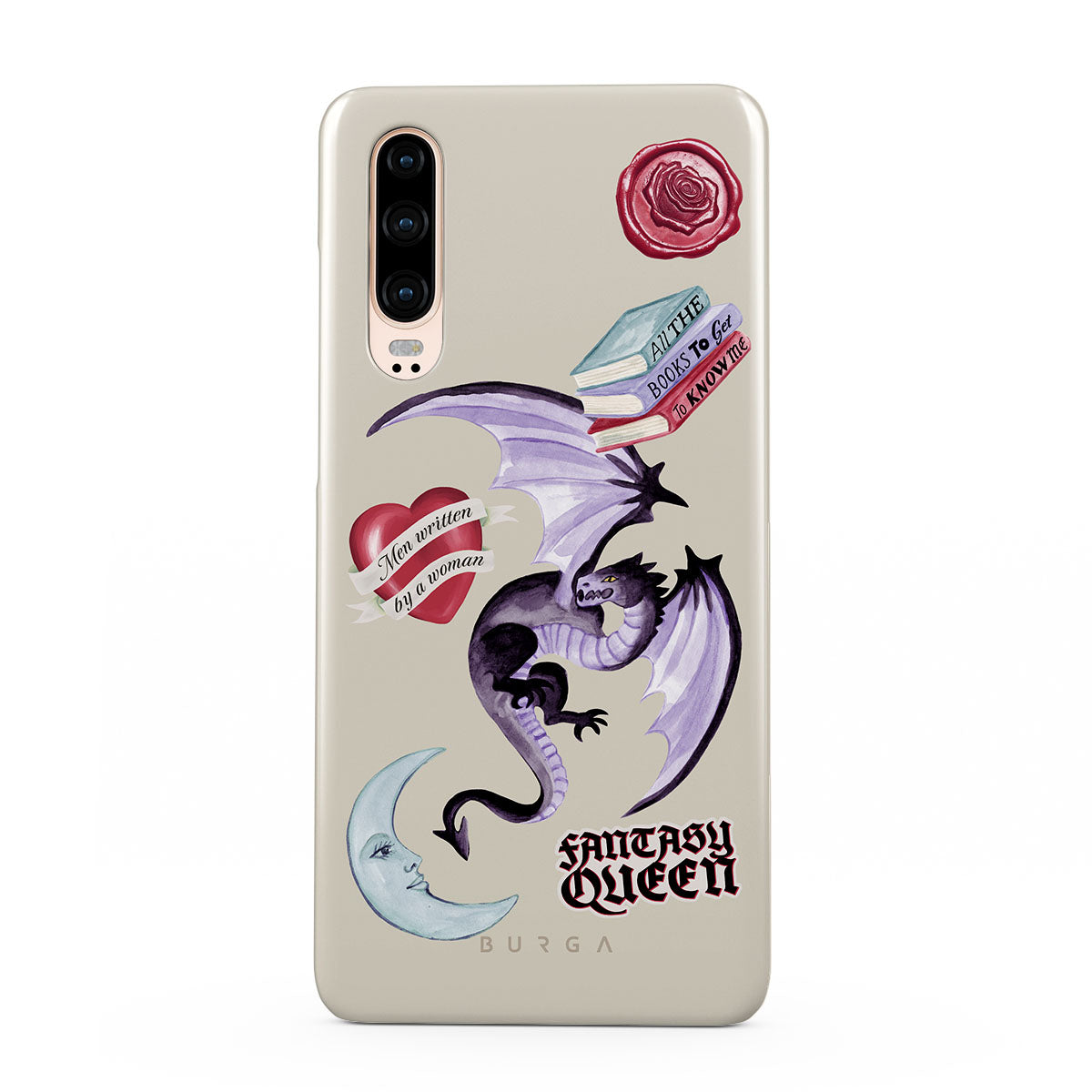 Kenmerken van dit design: paarse draak, sticker "Fantasy Queen", halve maan, paarse lakzegel, hart met boodschap, boeken.
