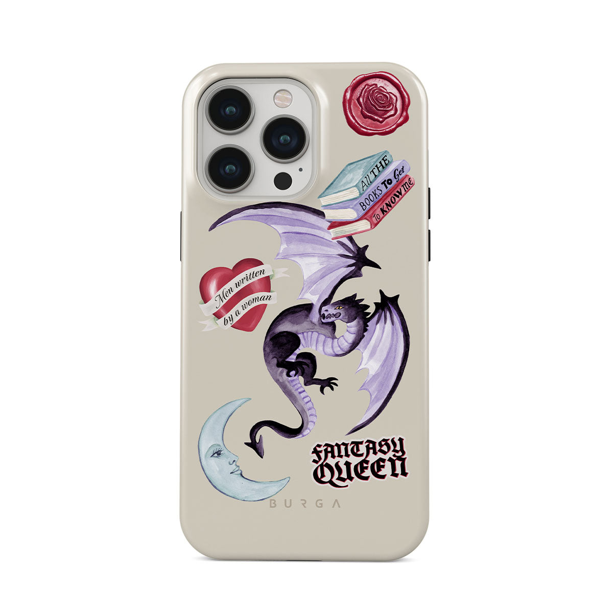 Kenmerken van dit design: paarse draak, sticker "Fantasy Queen", halve maan, paarse lakzegel, hart met boodschap, boeken.