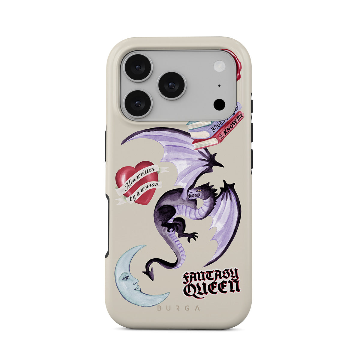 Kenmerken van dit design: paarse draak, sticker "Fantasy Queen", halve maan, paarse lakzegel, hart met boodschap, boeken.