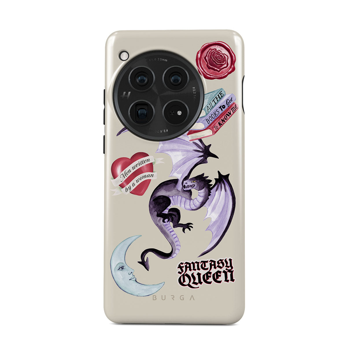 Kenmerken van dit design: paarse draak, sticker "Fantasy Queen", halve maan, paarse lakzegel, hart met boodschap, boeken.