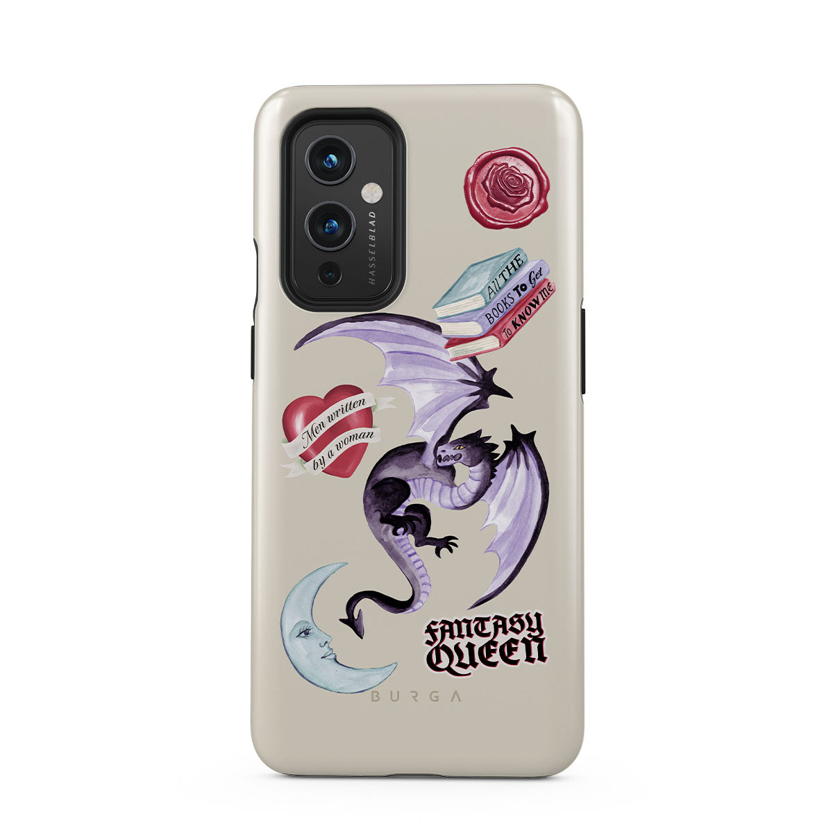 Kenmerken van dit design: paarse draak, sticker "Fantasy Queen", halve maan, paarse lakzegel, hart met boodschap, boeken.