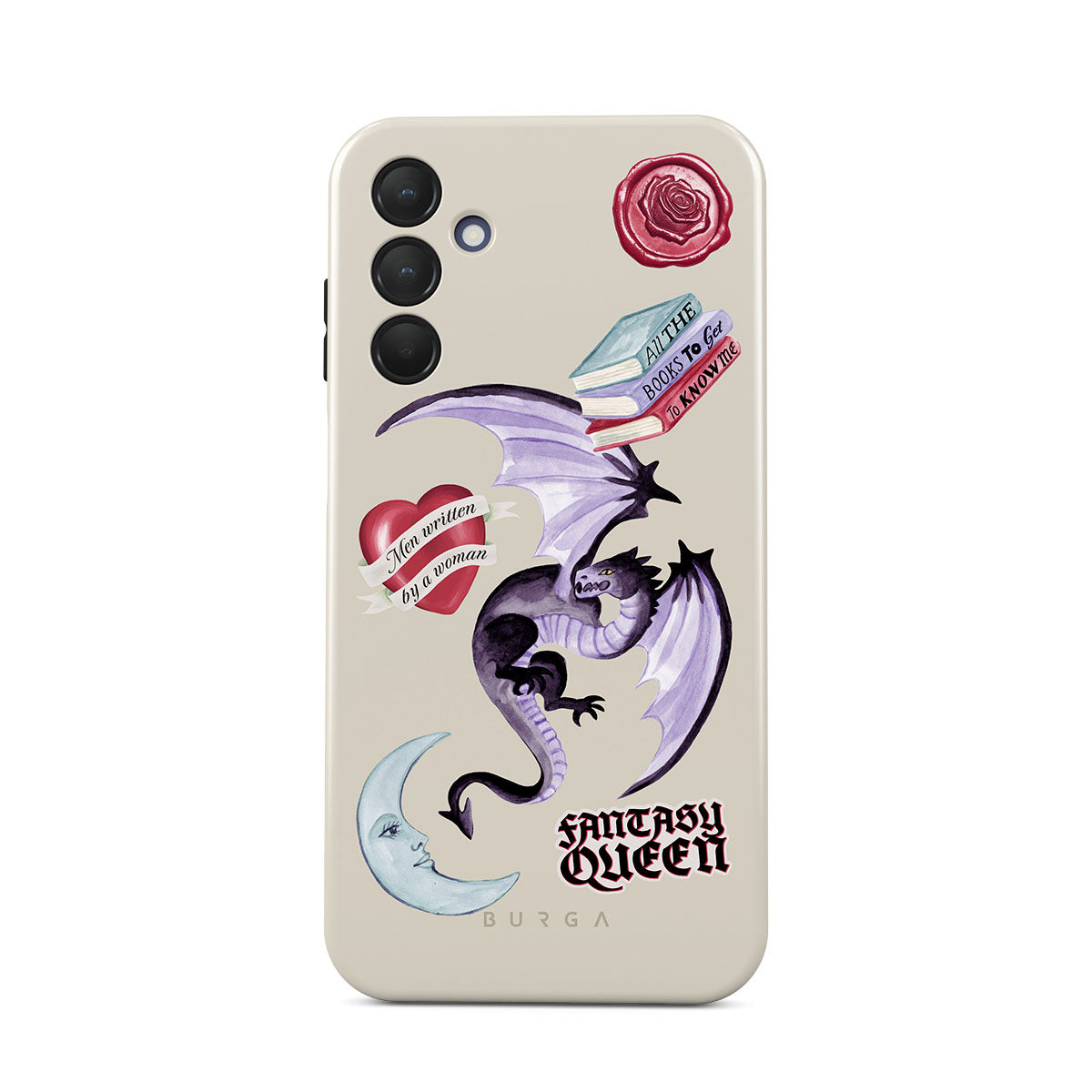 Kenmerken van dit design: paarse draak, sticker "Fantasy Queen", halve maan, paarse lakzegel, hart met boodschap, boeken.