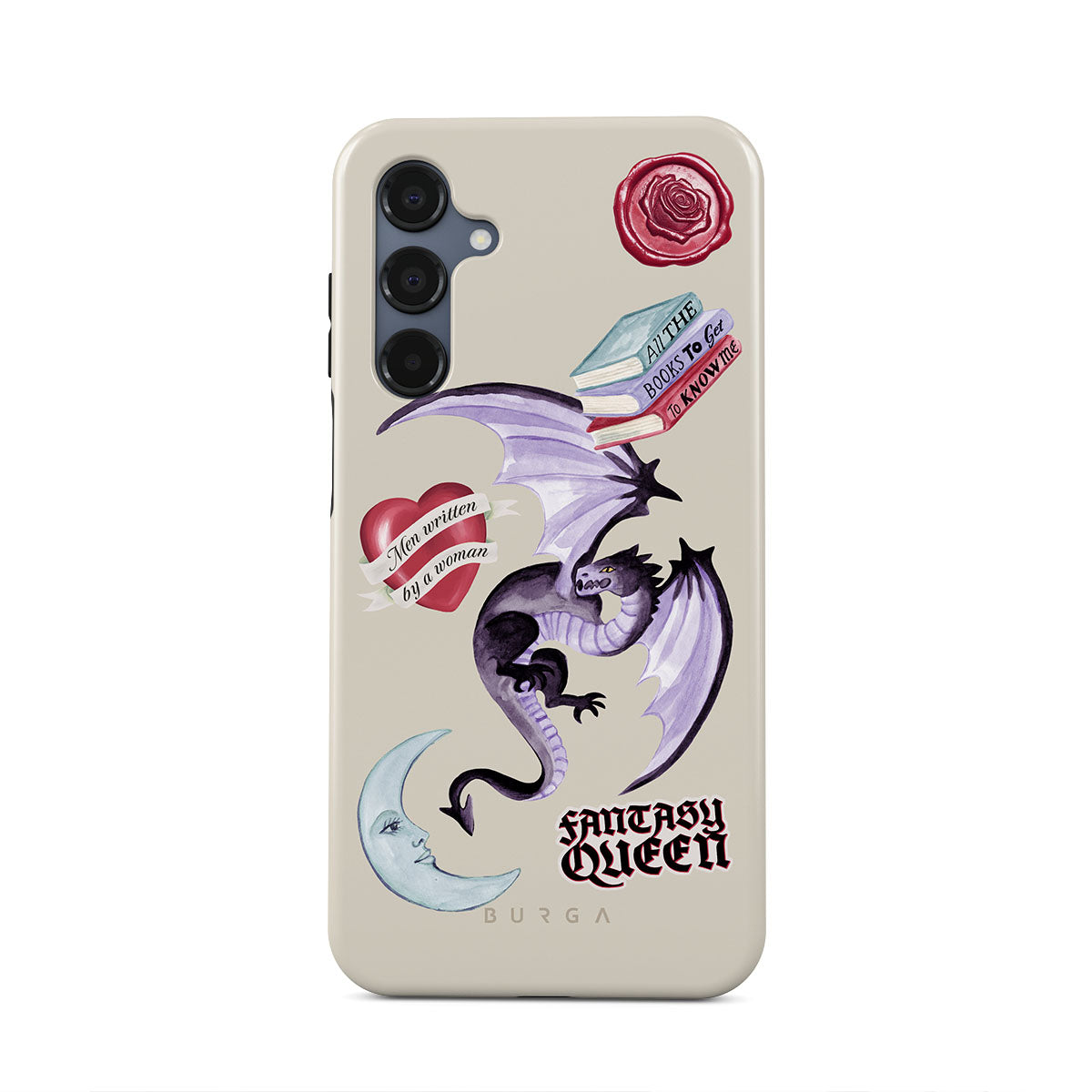 Kenmerken van dit design: paarse draak, sticker "Fantasy Queen", halve maan, paarse lakzegel, hart met boodschap, boeken.