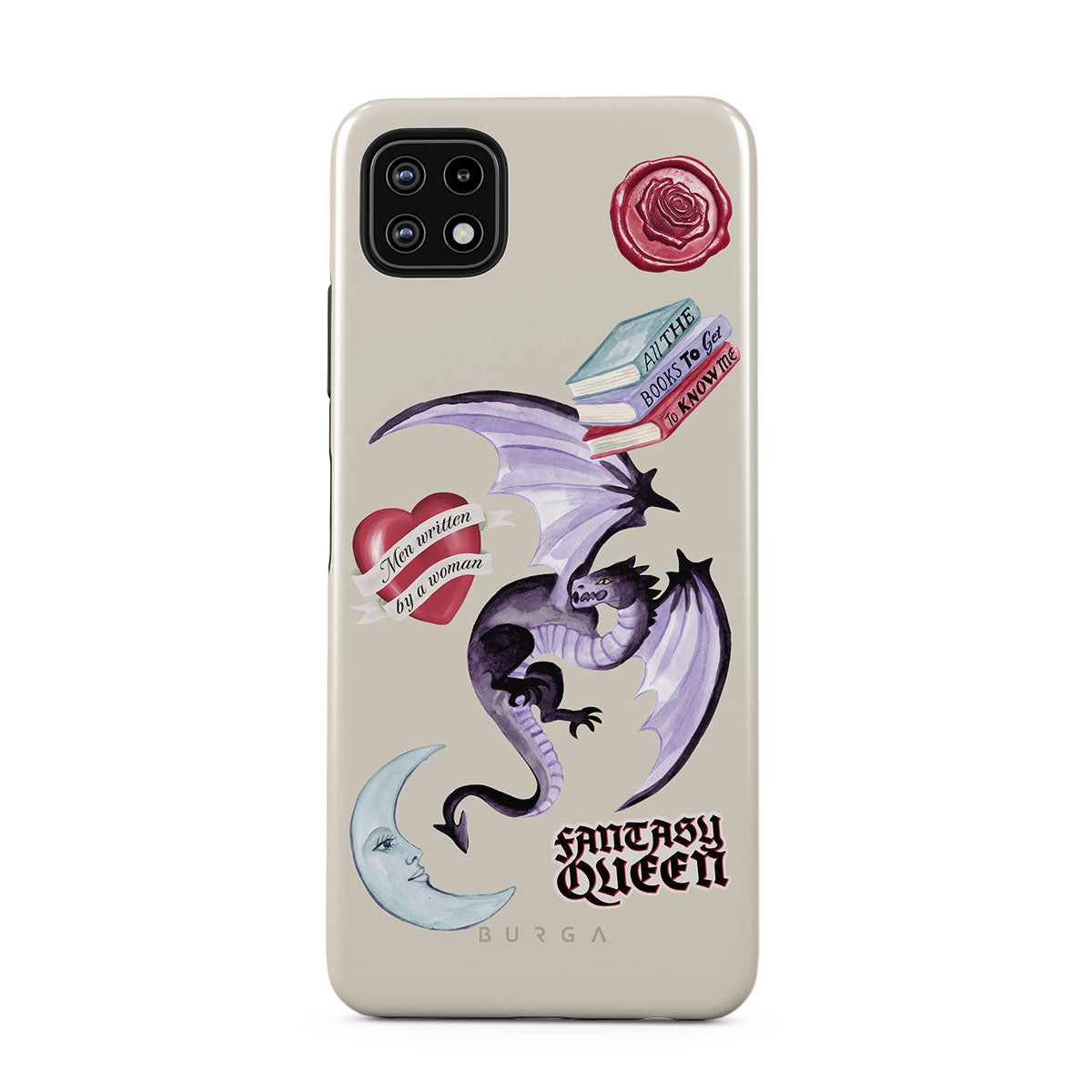 Kenmerken van dit design: paarse draak, sticker "Fantasy Queen", halve maan, paarse lakzegel, hart met boodschap, boeken.