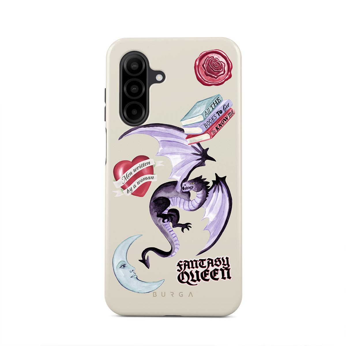 Kenmerken van dit design: paarse draak, sticker "Fantasy Queen", halve maan, paarse lakzegel, hart met boodschap, boeken.