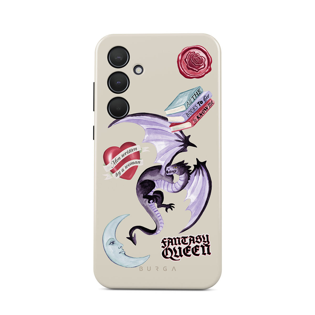 Kenmerken van dit design: paarse draak, sticker "Fantasy Queen", halve maan, paarse lakzegel, hart met boodschap, boeken.