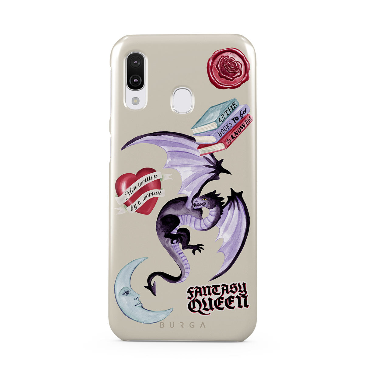 Kenmerken van dit design: paarse draak, sticker "Fantasy Queen", halve maan, paarse lakzegel, hart met boodschap, boeken.