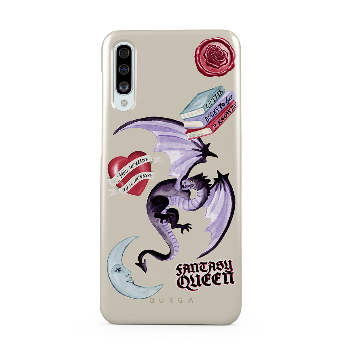 Kenmerken van dit design: paarse draak, sticker "Fantasy Queen", halve maan, paarse lakzegel, hart met boodschap, boeken.