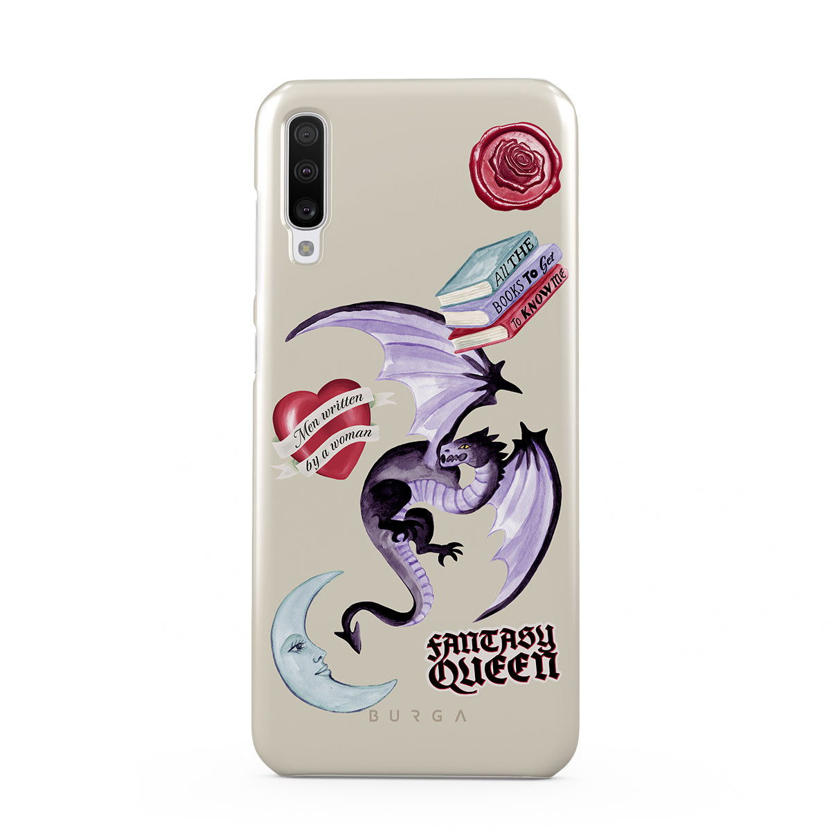 Kenmerken van dit design: paarse draak, sticker "Fantasy Queen", halve maan, paarse lakzegel, hart met boodschap, boeken.