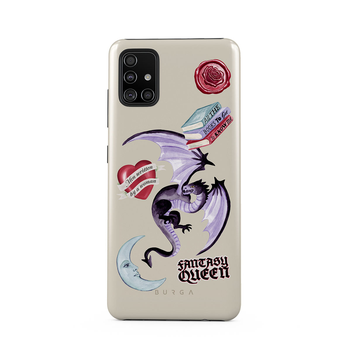 Kenmerken van dit design: paarse draak, sticker "Fantasy Queen", halve maan, paarse lakzegel, hart met boodschap, boeken.