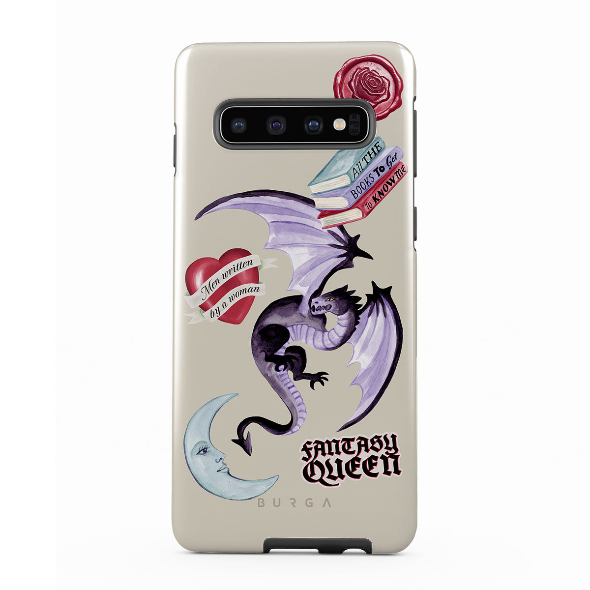 Kenmerken van dit design: paarse draak, sticker "Fantasy Queen", halve maan, paarse lakzegel, hart met boodschap, boeken.