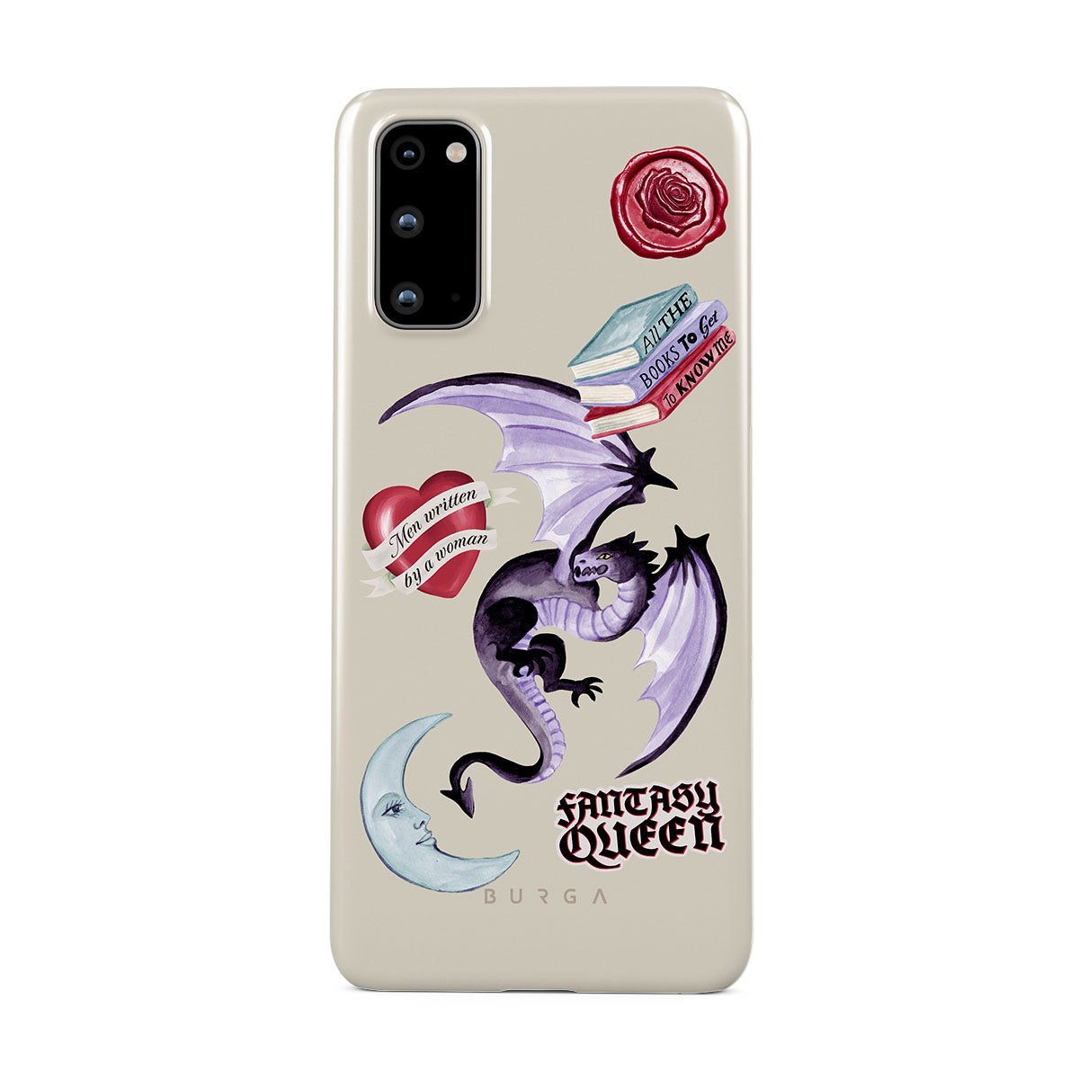 Kenmerken van dit design: paarse draak, sticker "Fantasy Queen", halve maan, paarse lakzegel, hart met boodschap, boeken.